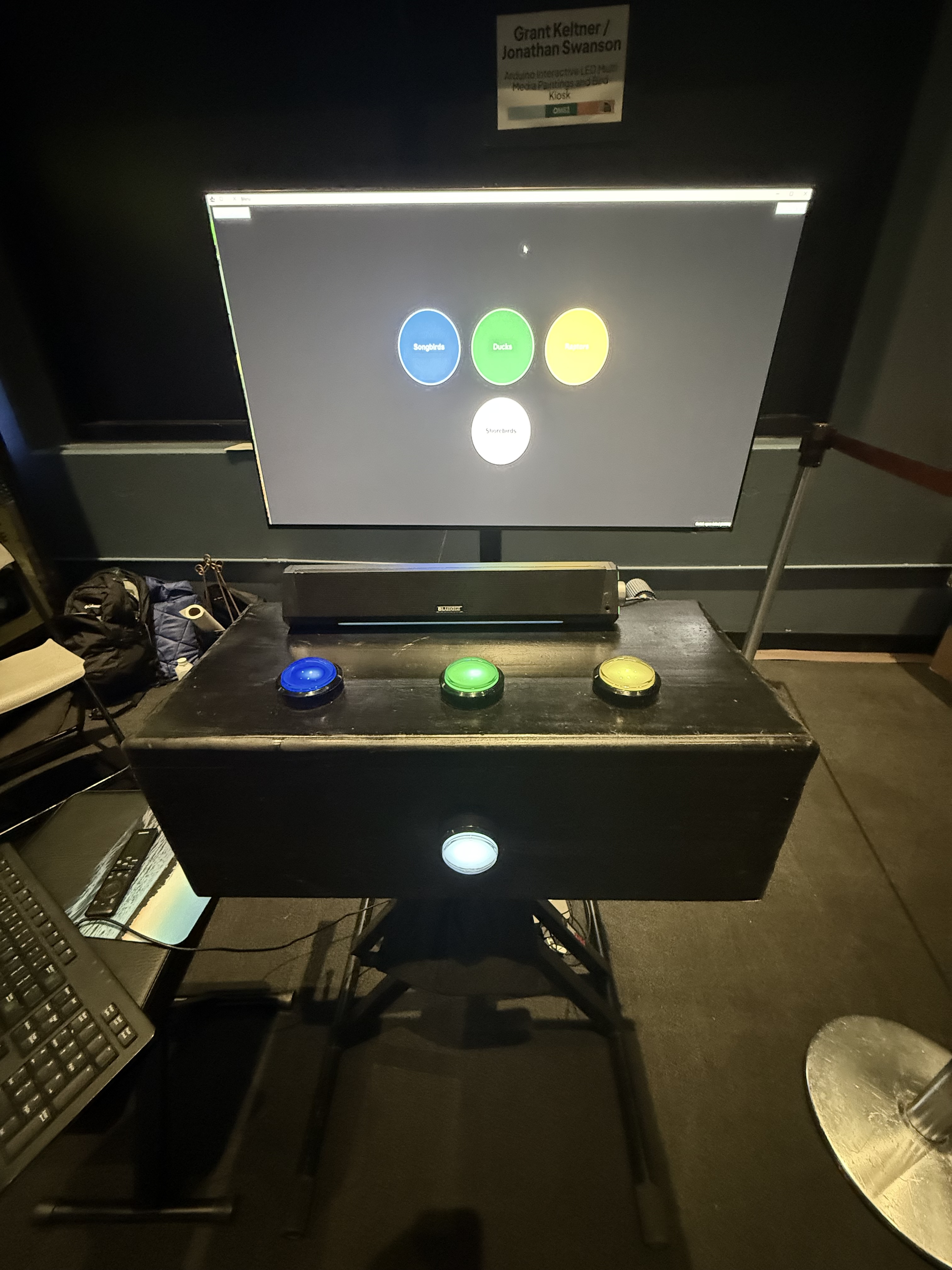 I had the pleasure of volunteering at the Oregon Museum of Science and Industry (OMSI) Science Fair on September 13–14, 2025, where I ran an arcade-style, multiple-choice bird quiz designed for kids. The setup combined a 65″ OLED display showing short nature documentaries and the quiz interface, three tactile buttons that triggered interactive sounds, and randomized photos of birds from several categories — songbirds, shorebirds (please tell me if you meant something else), raptors, and ducks.